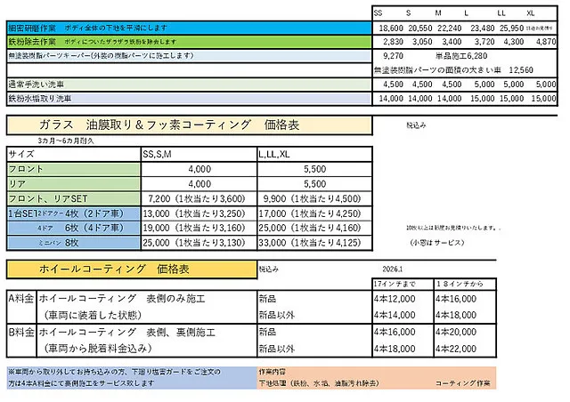ホイールコーティング 価格表